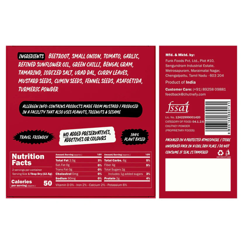 Forget the reds, the greens and the whites - the Chutnefy Beetroot Chutney from our Specials Range is packed with the Un'beet'able rich colour and taste of fresh beetroots, brought together with the familiar ingredients that make up a traditional Udupi chutney!