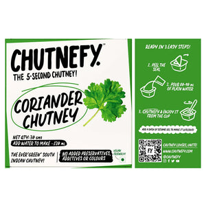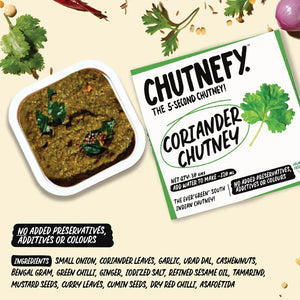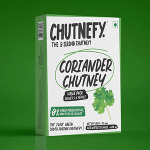 One amongst the Chutney trinity and part of our Staples Range, the Chutnefy Coriander Chutney brings to you that classic flavour that goes perfectly with your crisp Dosai & Vadai & Adai, or a soft and fluffy idli - actually, with anything you'd like a mild and flavourful accompaniment for!