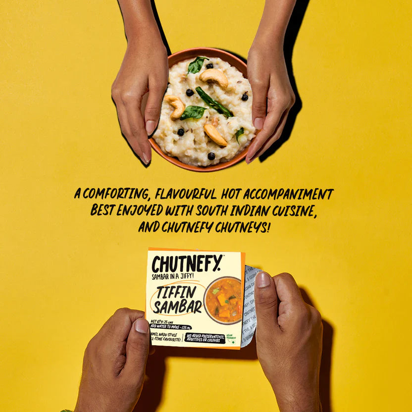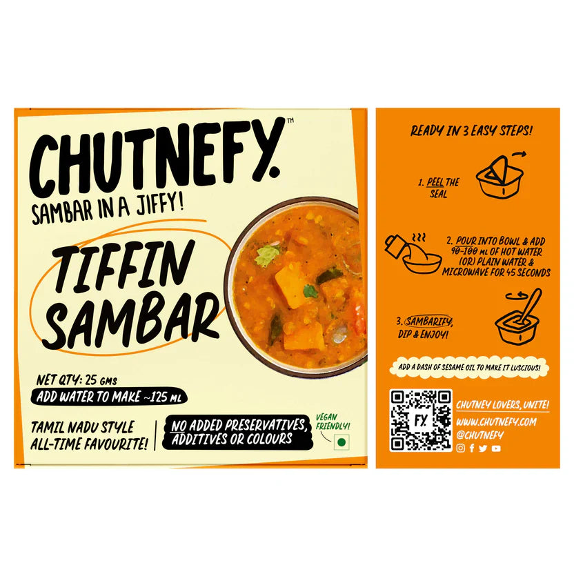 Each Chutnefy Sambar comes in an easy, convenient single-use pack to give you the flavour punch that'll hit the spot every single time, and gives you ~125ml of Sambar once mixed - easily enjoyed by 2!