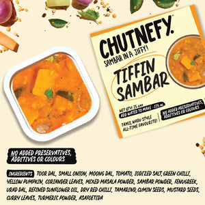 Piping hot and poured generously over your steaming idli and vada, with a splash here and a drip there. The Chutnefy Sambar from our Sidekicks Range is reminiscent of every fulfilling Tamil-style tiffin you've enjoyed, with its warm, tangy aroma that wafts up from your plate and makes its way to your heart!