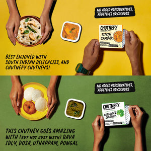 All your staple Tiffin accompaniments, in one convenient pack. This assortment contains 3 of your favourite Chutneys, and 1 pack of sambar. Each pack makes ~100ml+ of Chutney and ~125ml+ of Sambar that can be easily enjoyed by 2-3!