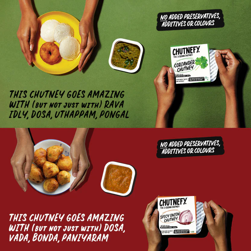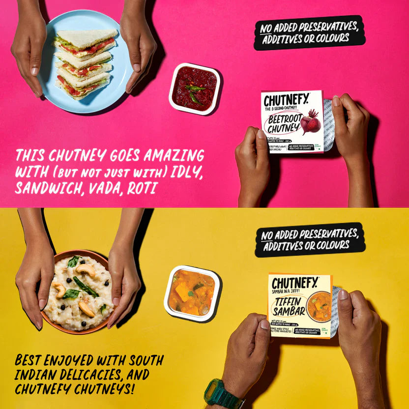 Each chutney pack makes ~100ml+ of Chutney and each sambar pack makes ~125ml+ of Sambar that can be easily enjoyed by 2-3!