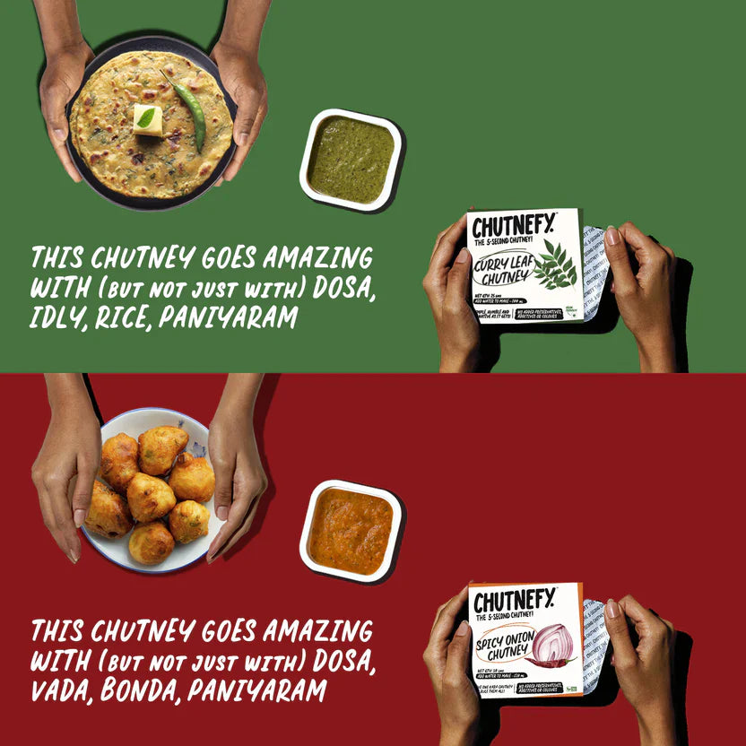 This Ultimate Chutney Combo pack comes with easy, convenient single-use packs to give you an authentic experience that'll hit the spot every single time. And it's ready in just a stir! So no more chopping, cooking or dishwashing! Just Peel. Pour. Chutnefy.
